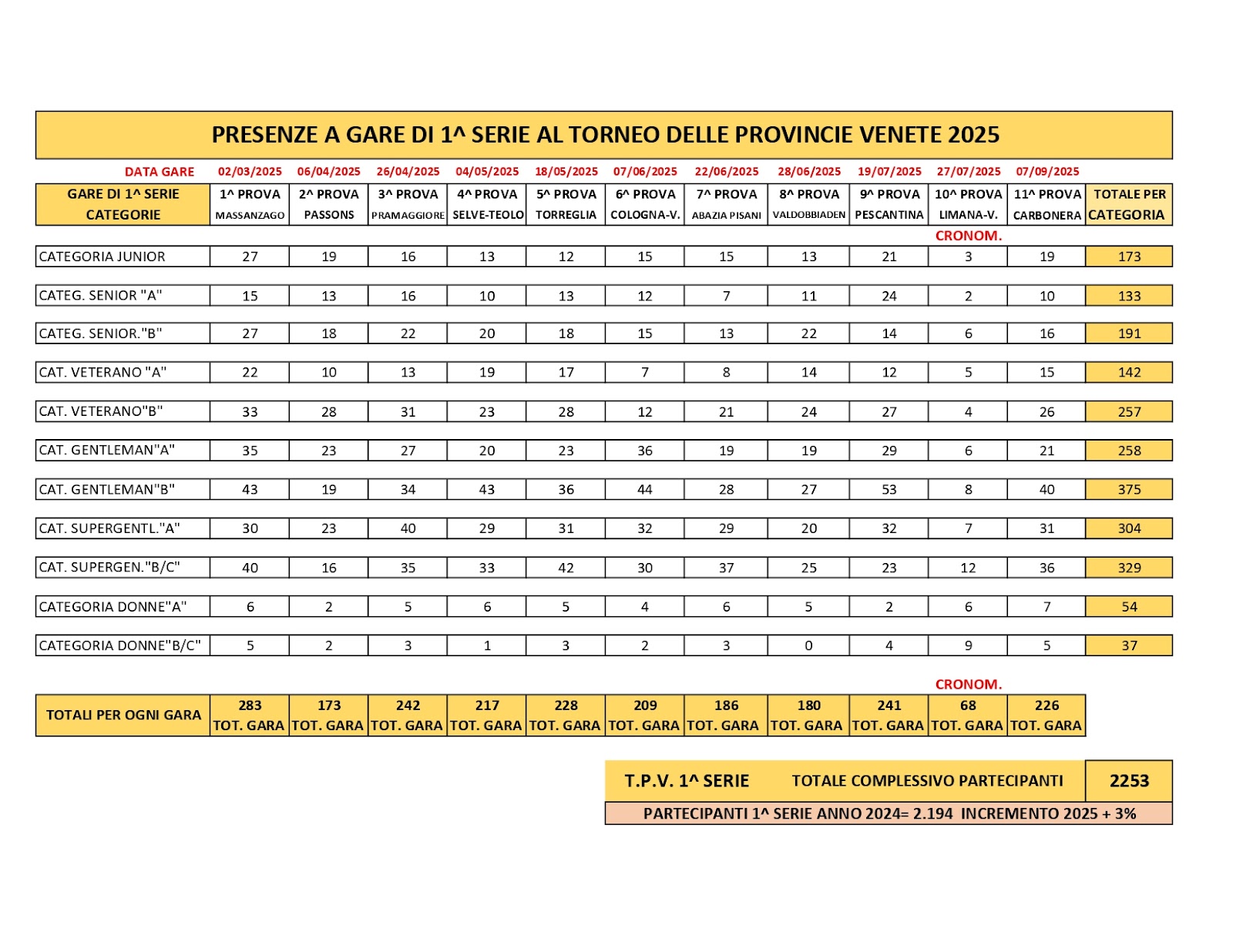 - 1ª Serie: 2.253 partecipanti totali (+3% rispetto al 2024) distribuiti in 11 gare